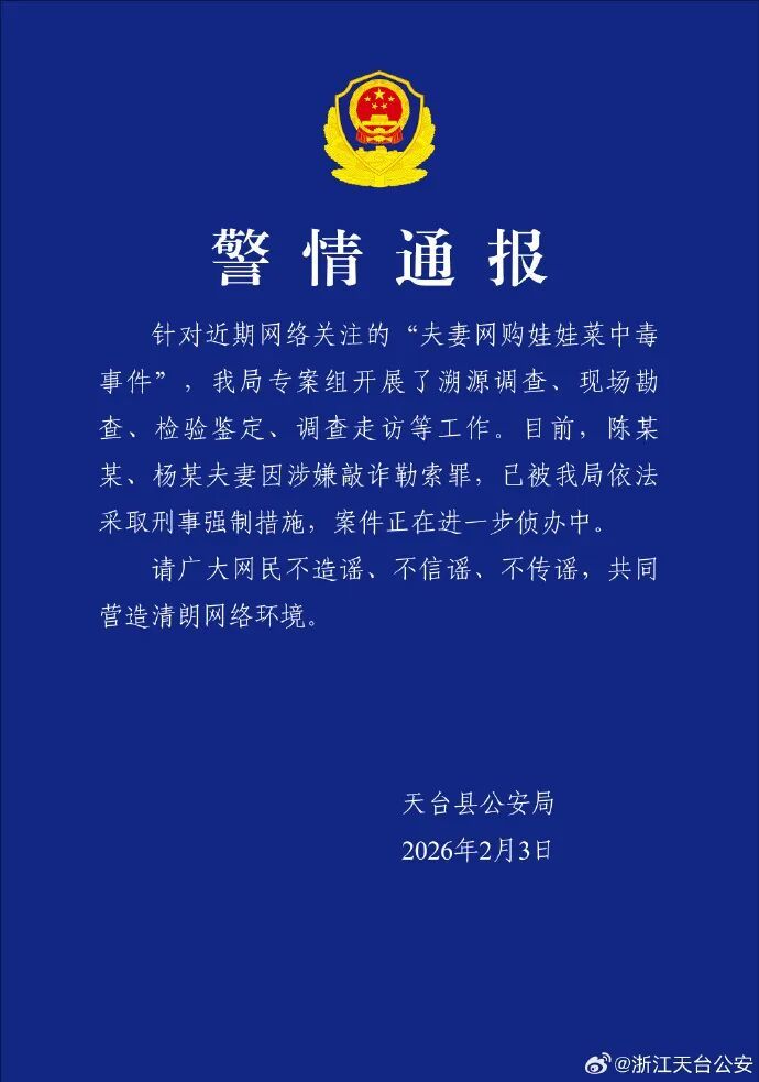 2月3日晚,浙江天台县公安局发布正式通报:陈某某、杨某夫妻因涉嫌敲诈勒索罪,已被依法采取刑事强制措施。